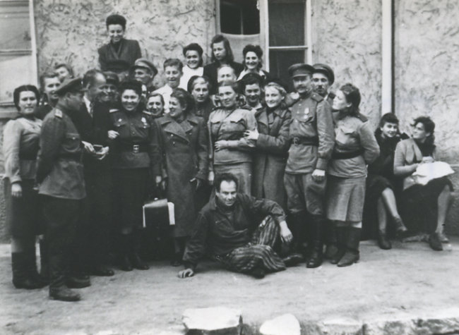 Na zdjęciu: Pracownicy szpitala Polskiego Czerwonego Krzyża razem z sowieckimi lekarzami i sanitariuszkami. Zdjęcie wykonane przed dawnym szpitalem SS. Wśród stojących czwarty z lewej dr Józef Bellert – naczelny lekarz szpitala PCK, i obok, trzymająca go pod rękę, mjr Margarita Żylinskaja – komendantka jednego ze szpitali polowych. Źródło: Archiwum Państwowego Muzeum Auschwitz-Birkenau (dalej: APMA-B) …