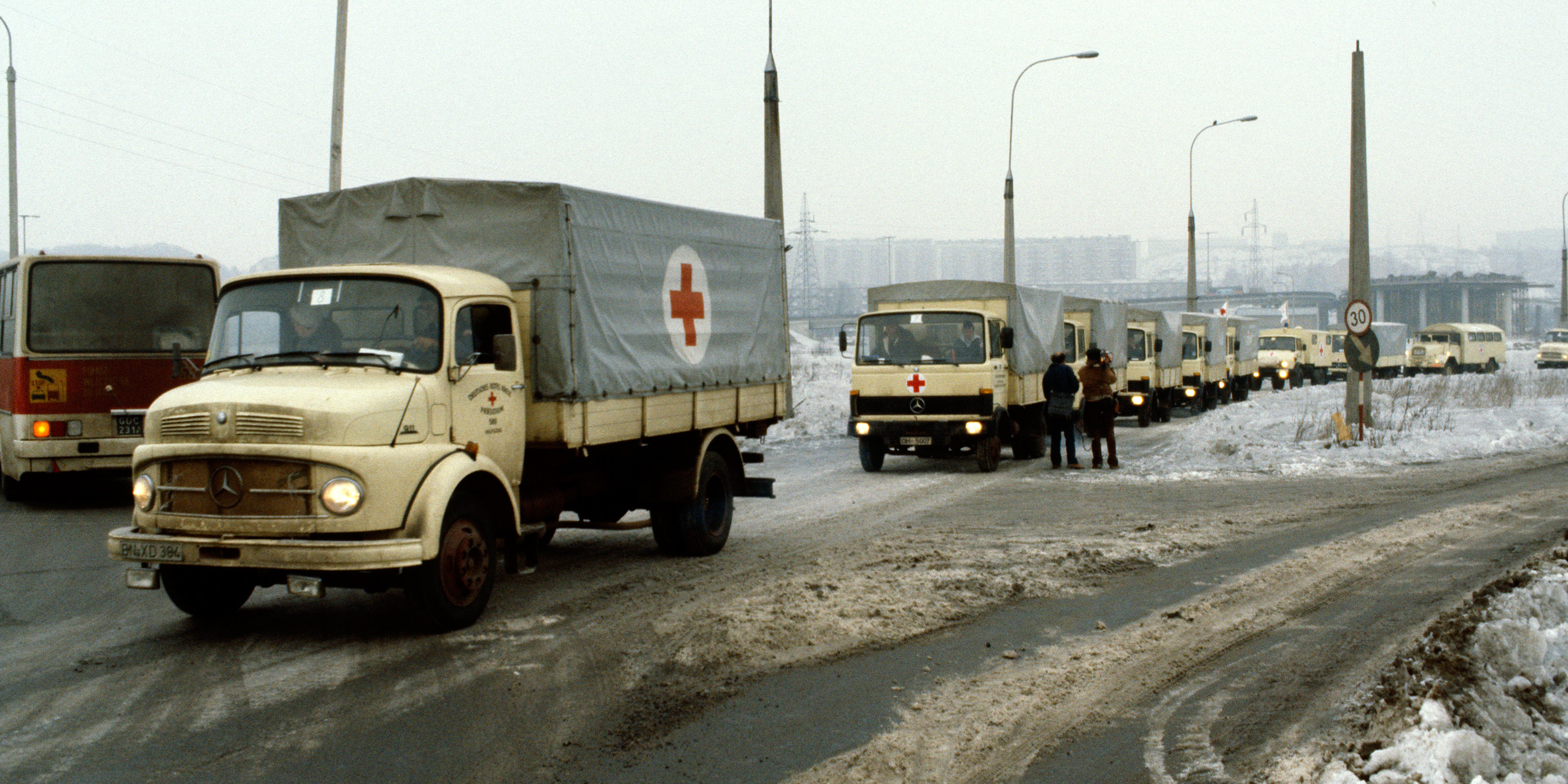 - Sopot. Konwój ciężarówek przewożących pomoc z Republiki Federalnej Niemiec. fot. arch. ICRC