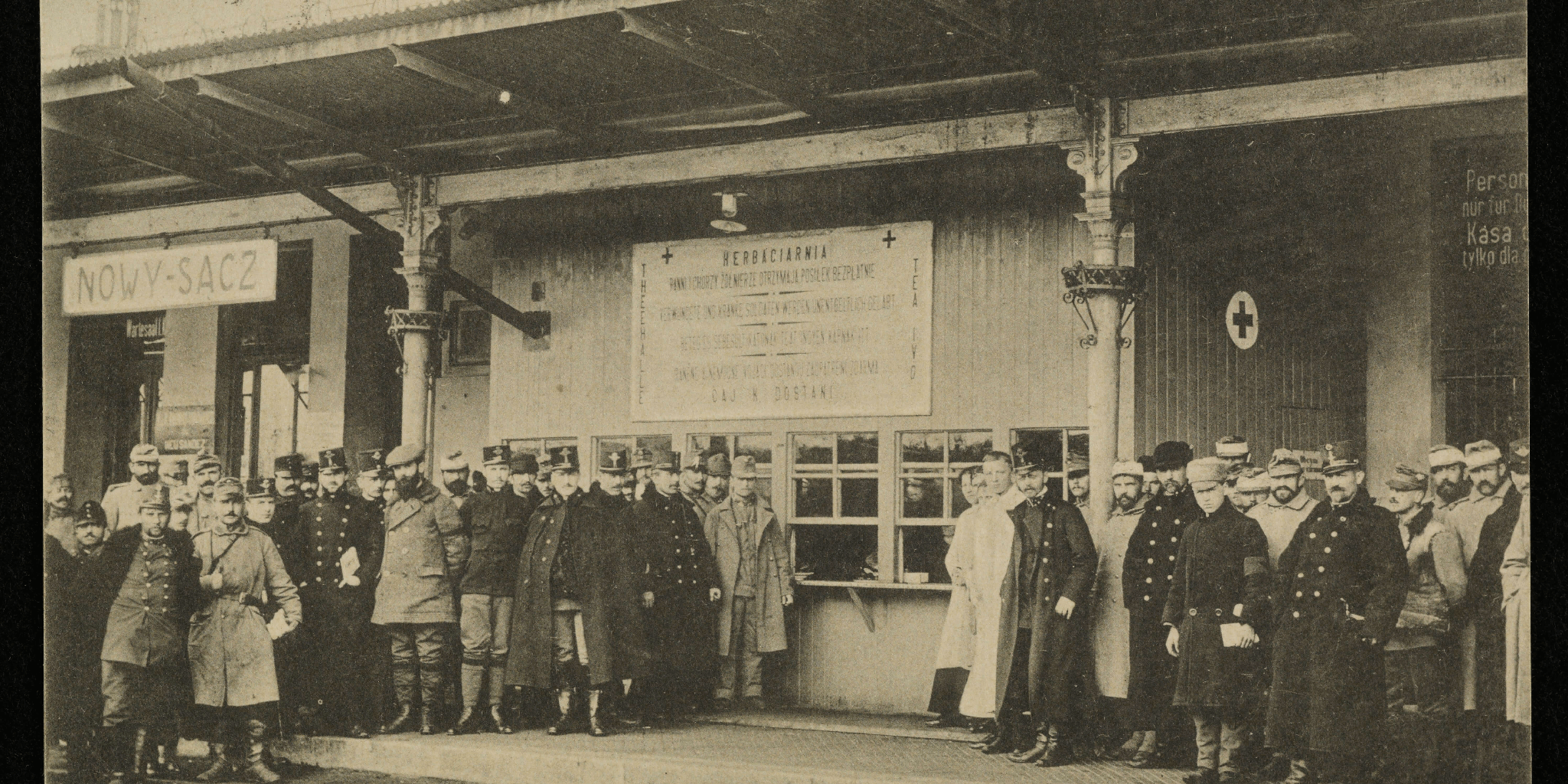 W okresie od września do listopada 1914 r. z inicjatywy grona urzędników kolejowych rozpoczęła działalność, na peronie dworca kolejowego, „Herbaciarnia Czerwonego Krzyża”. Komitet tworzyli inż. Henryk Suchanek – naczelnik Warsztatów, Albina Małecka, Bronisław Romański, Antoni Lewicki, Konstanty Heumann, Antoni Filip, Józef Nowak, Zofia Suchanek, Maria Pazdanowska, Maria Filipowiczowa, Maria Chodacka, dr Henryk Nieć i Gustaw Wierzbicki. Zbierano datki i produkty żywnościowe. Początki były skromne lecz z czasem, jak możemy przeczytać w „Sprawozdaniu z Herbaciarni Czerwonego Krzyża na dworcu kolejowym w Nowym Sączu za lata 1914-1915”, zasoby powiększyły się i lokal nabrał rozmachu