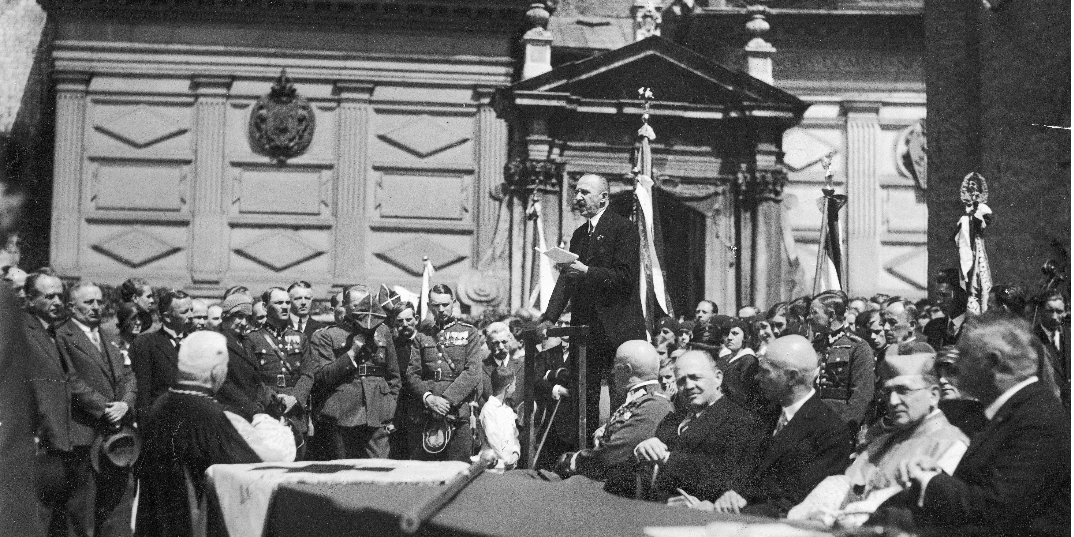 Uczestnicy uroczystości zebrani przed katedrą wawelską. Przemawia prezes krakowskiego oddziału PCK Jarosiński. Za stołem na prawo od mównicy siedzą: generał Stanisław Wróblewski, wiceprezydent Krakowa Piotr Wielgus, wojewoda krakowski Mikołaj Kwaśniewski, biskup Michał Godlewski. Źródło NAC Sygnatura: 1-C-856